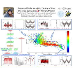 | 5.01 | Lauren Herrington | Massachusetts Institute of Technology | Estimating Rotation Rates of the Brightest Solar-type Stars with TESS | Magnetic features rotating across the surface of a star create photometric variations on timescales of days to weeks, enabling direct measurement of a star’s rotation rate. These variations are low amplitude, making them difficult to detect from the ground, but with TESS, rotational modulation can be observed in hundreds of bright stars. Here we present a catalog of estimated rotation rates and photometric amplitudes for over 200 of the brightest solar-type stars. Because automated searches are subject to spurious detections regardless of periodogram power, we constrained our estimations via direct visual inspection. The resulting list has a very low false positive rate, and will be used to inform target selection for the Copernicus Constellation, a proposed satellite constellation designed to discover Earth-like exoplanets transiting nearby Sun-like stars. Copernicus’ critical Phase 1 mission relies on targeting only the fastest-rotating stars, in order to resolve asteroseismic mode splits and identify stars with inclinations favorable to exoplanetary transits. This TESS-based rotation catalog will allow us to optimize Copernicus’ asteroseismic search, extending the amount of mission time available for the Phase 2 transit search. |